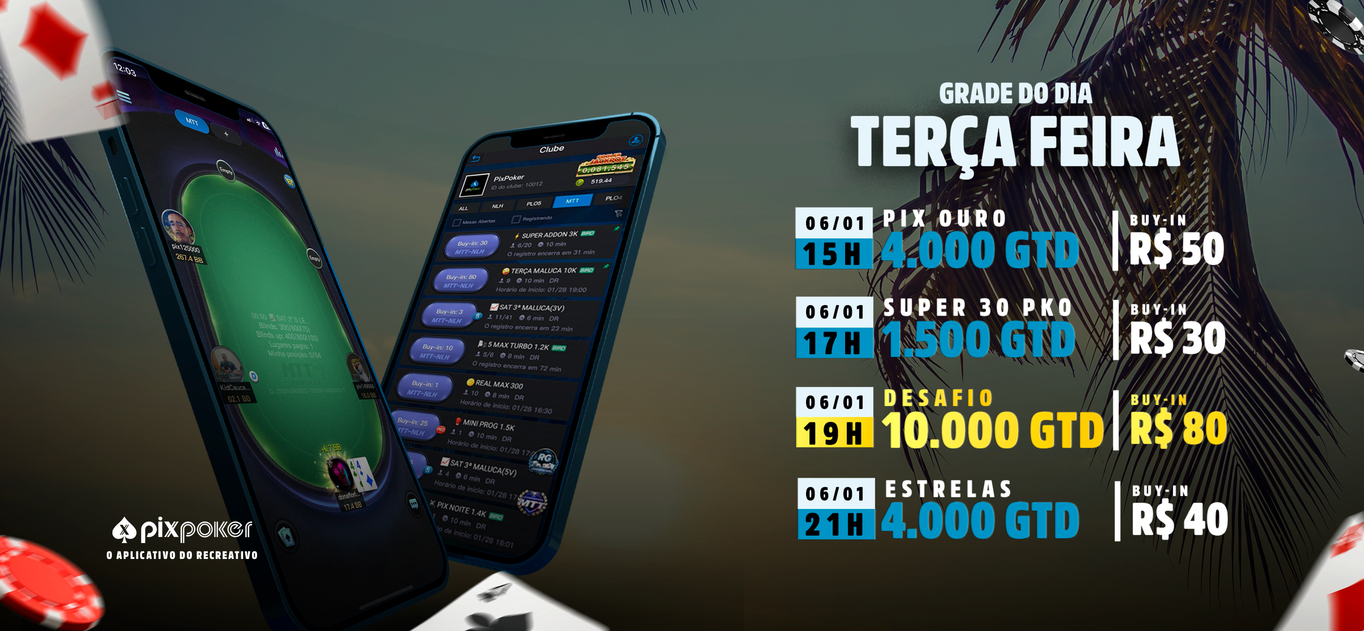 Este segundo dia de eventos promete aquecer essa disputa. O “Pix Monster”, com R$3.000 garantidos, tem início às 15h, buy-in de R$30, rebuys e add-on disponíveis. No início da noite, às 19h, começa o “Prog do Ramon”, jogado em formato KO, com R$8.000 em premiação garantida e buy-in de R$100. Fechando a noite, com início às 20h30, temos o satélite para o Navio PixPoker, de buy-in R$90 e 1 pacote Gold Premium garantido.