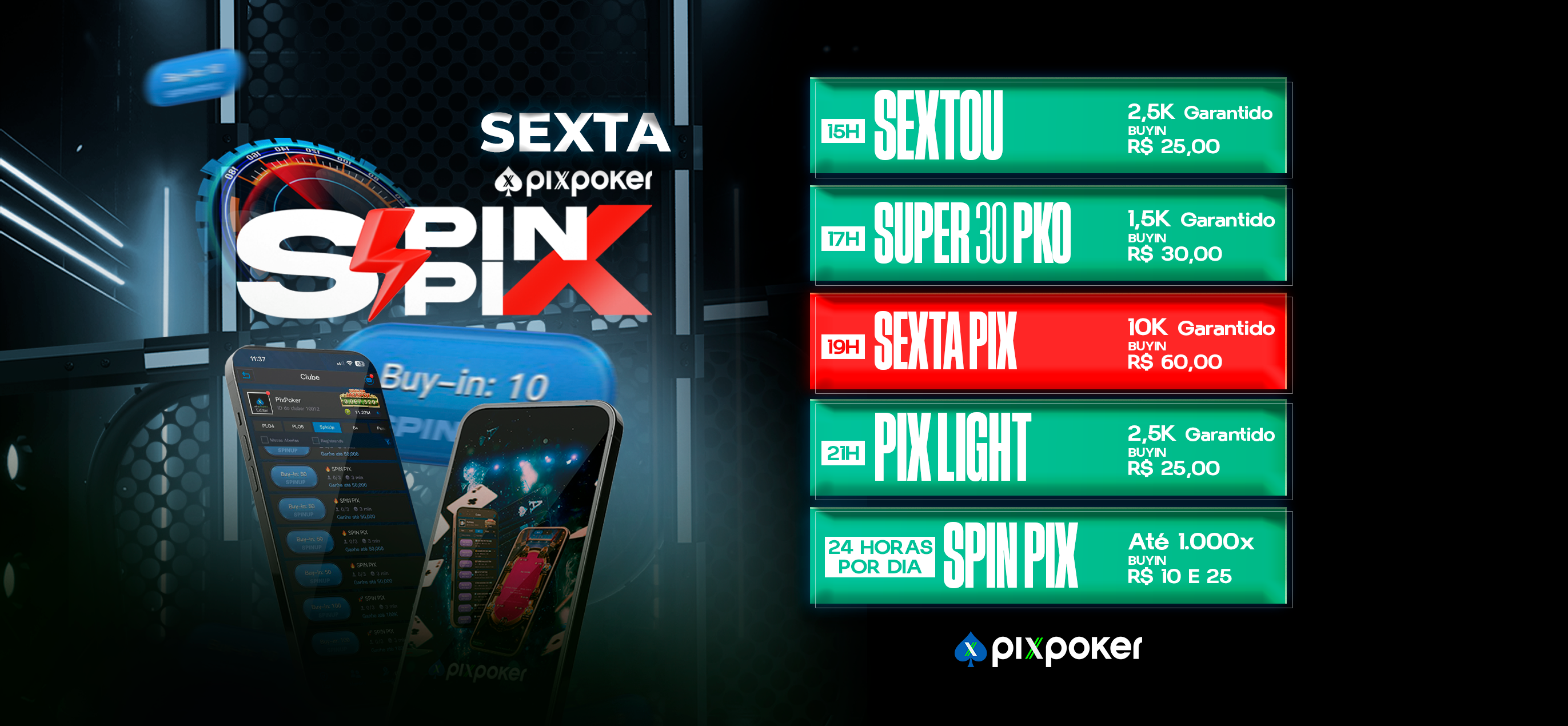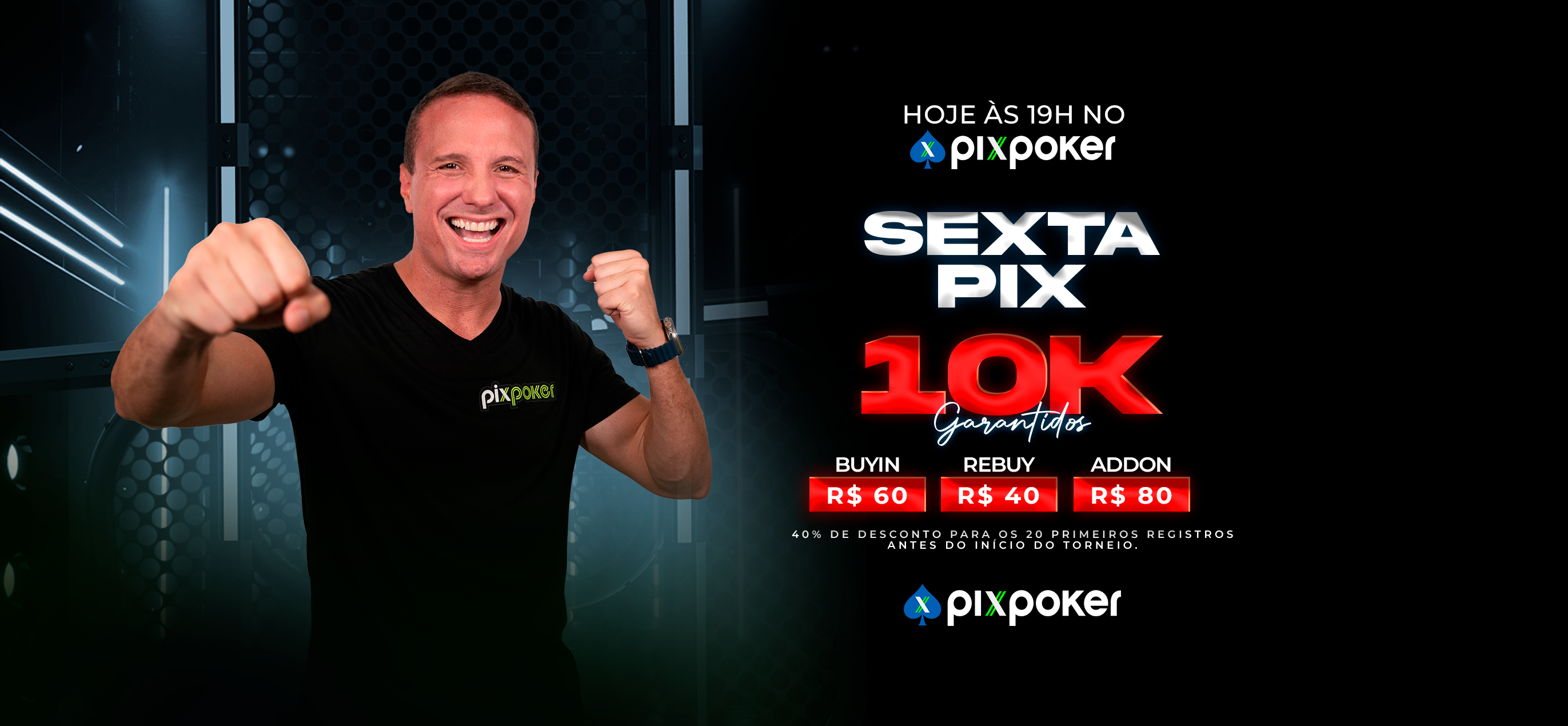 Nesta semana especial, a cada dia serão disputados 2 torneios no PixPoker (sempre iniciando nos horários de 15h e 21h), em que os 10 primeiros de cada torneio ganharão tickets de R$10 para utilizarem no Vencedor.