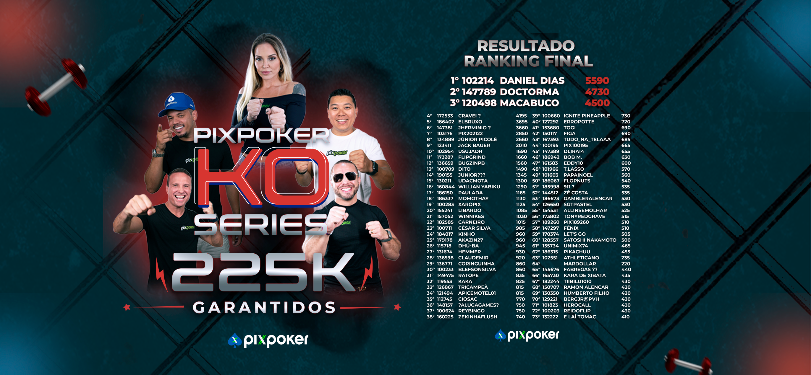 A segunda colocação ficou com DoctorMA, e macabuco fechou o pódio em terceiro lugar. Todos eles protagonizaram uma disputa ponto a ponto com o líder ao longo de toda a semana. A diferença entre as primeiras posições foi pequena, refletindo o equilíbrio e o alto nível dos competidores. Uma verdadeira batalha até o último torneio, exatamente como a galera do PixPoker gosta. Além disso, outros 12 jogadores receberam recompensas extras por suas pontuações, fechando um ranking que premiou os 15 melhores da série.